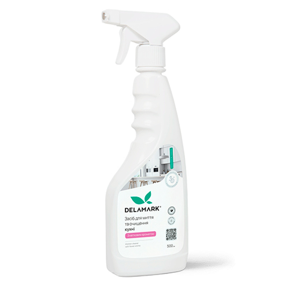 Засіб для миття й очищення кухні DeLaMark з квітковим ароматом дуже економний, легко наноситься, добре змивається й має зручну упаковку з розпилювачем