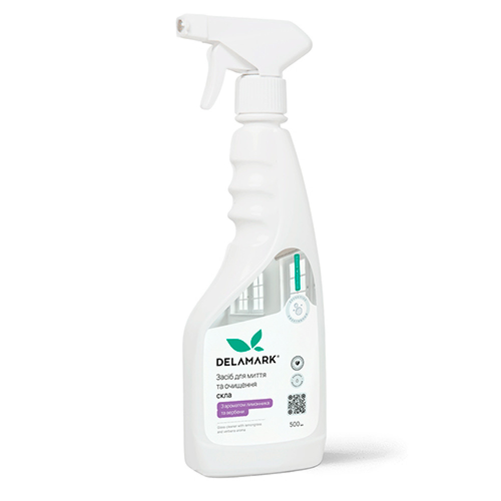 Концентрований засіб для миття та очищення скла DeLaMark із освіжаючим ароматом лимонника та вербени дуже економний та має зручну упаковку з розпилювачем.