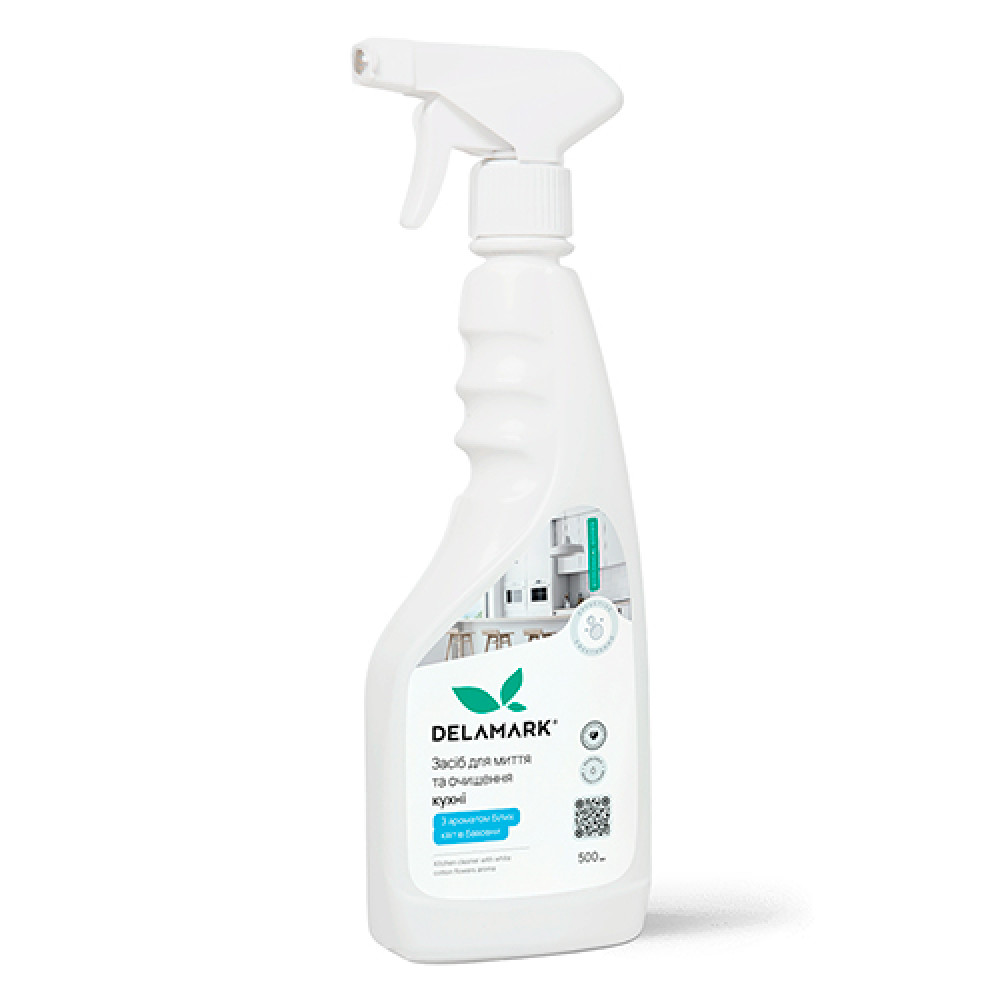 Засіб для миття та очищення кухні DeLaMark із ніжним ароматом білих квітів бавовни дуже економний, легко наноситься, добре змивається та має зручну упаковку з розпилювачем для комфортного використання.