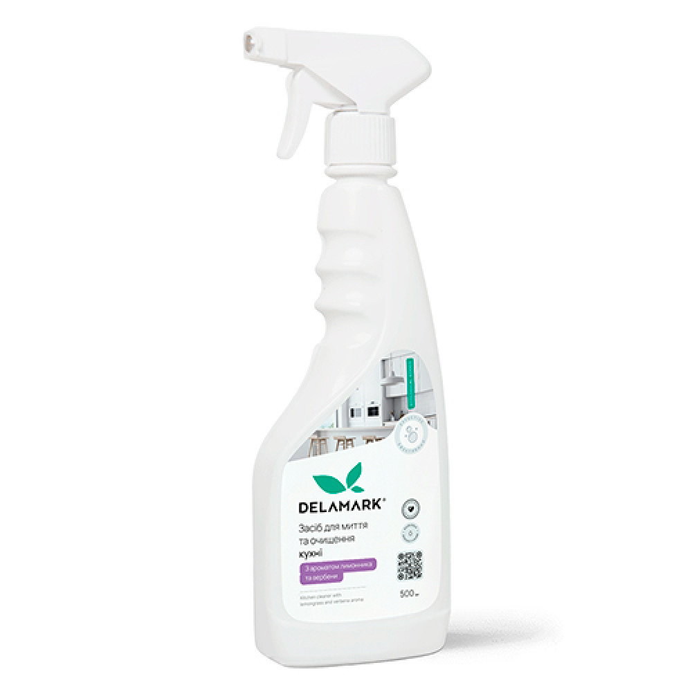 Засіб для миття та очищення кухні DeLaMark із освіжаючим ароматом лимонника та вербени дуже економний, легко наноситься, добре змивається та має зручну упаковку з розпилювачем для комфортного використання.