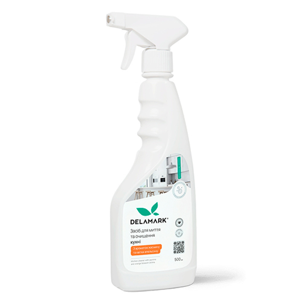 Засіб для миття та очищення кухні DeLaMark із вишуканим ароматом жасмину та апельсинової квітки дуже економний, легко наноситься, добре змивається та має зручну упаковку з розпилювачем для комфортного використання.