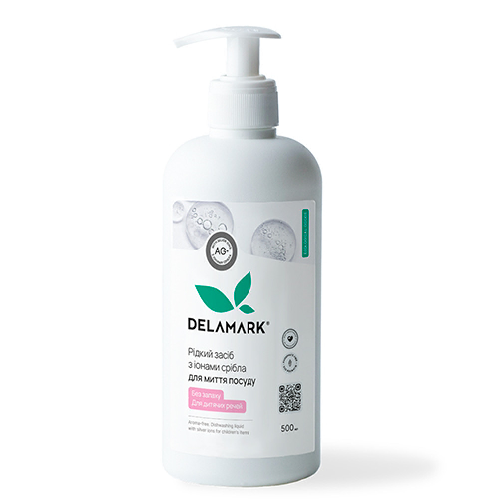Опис Засіб для миття посуду DeLaMark з іонами срібла для дитячого посуду без запаху 0,5 л