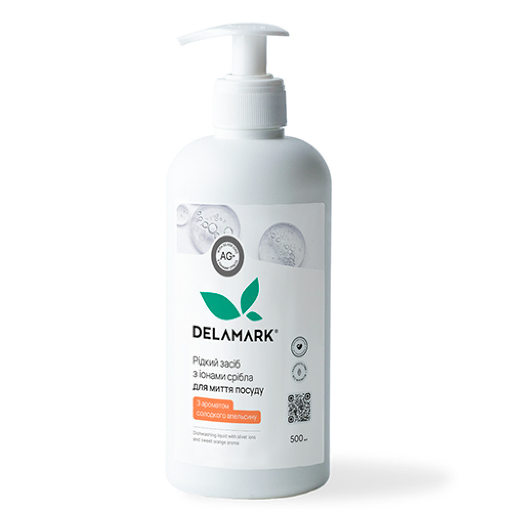 Концентрований засіб для миття посуду DeLaMark Солодкий апельсин з іонами срібла розроблений за сучасними технологіями, щоб забезпечити чудовий результат і захист рук. До складу рідини входять іони срібла в нетоксичній та добре розчинній органічній формі — як-от солі срібла з лимонною кислотою. Засіб утворює мало піни, але прекрасно справляється з жиром навіть у холодній воді.