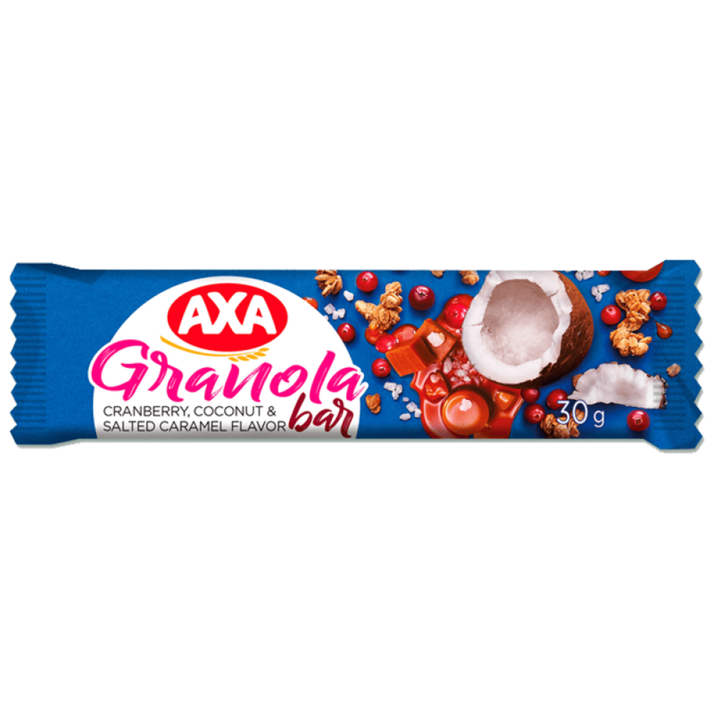 Опис Батончик АХА гранола з журавлиною, кокосом та смаком солоної карамелі 30г