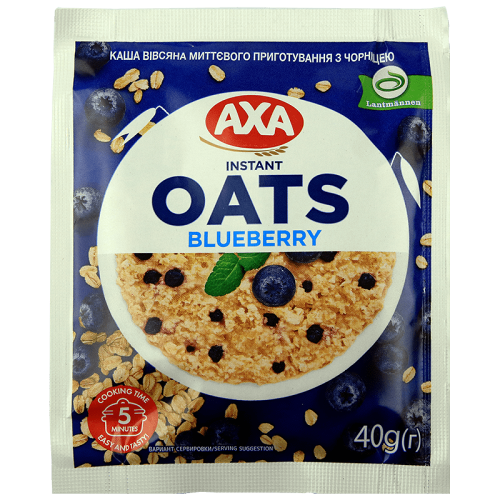 склад: пластівці вівсяні 73,2%, цукор, сушена чорниця 3%, суха молочна сироватка, сіль кухонна, ароматизатор «ваніль». Вага: 40 г