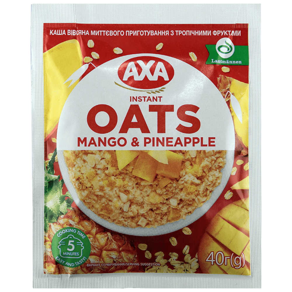 Склад: пластівці вівсяні (74,2%), цукор, суха молочна сироватка, суміш шматочків сублімованих фруктів 3% (ананас, манго у змінній пропорції), сіль кухонна, ароматизатор «манго». Вага: 40 г