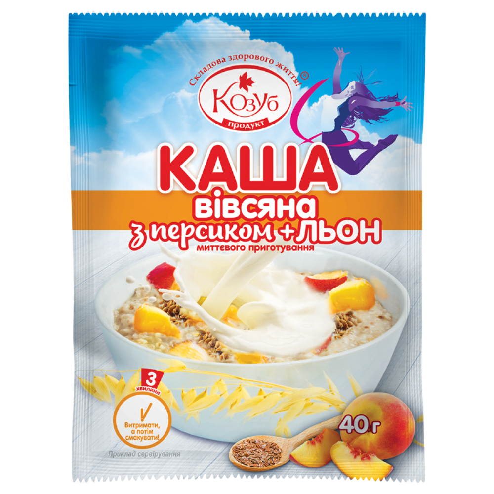 Порційна каша складається з вівсяних пластівців з персиком + льон. Для приготування досить залити окропом. Вироблено на основі «Найніжніших*» вівсяних пластівців ТМ Козуб продукт. * У порівнянні з іншими пластівцями ТОВ «Фірма ДІАМАНТ ЛТД». Пластівці не потребують варіння.