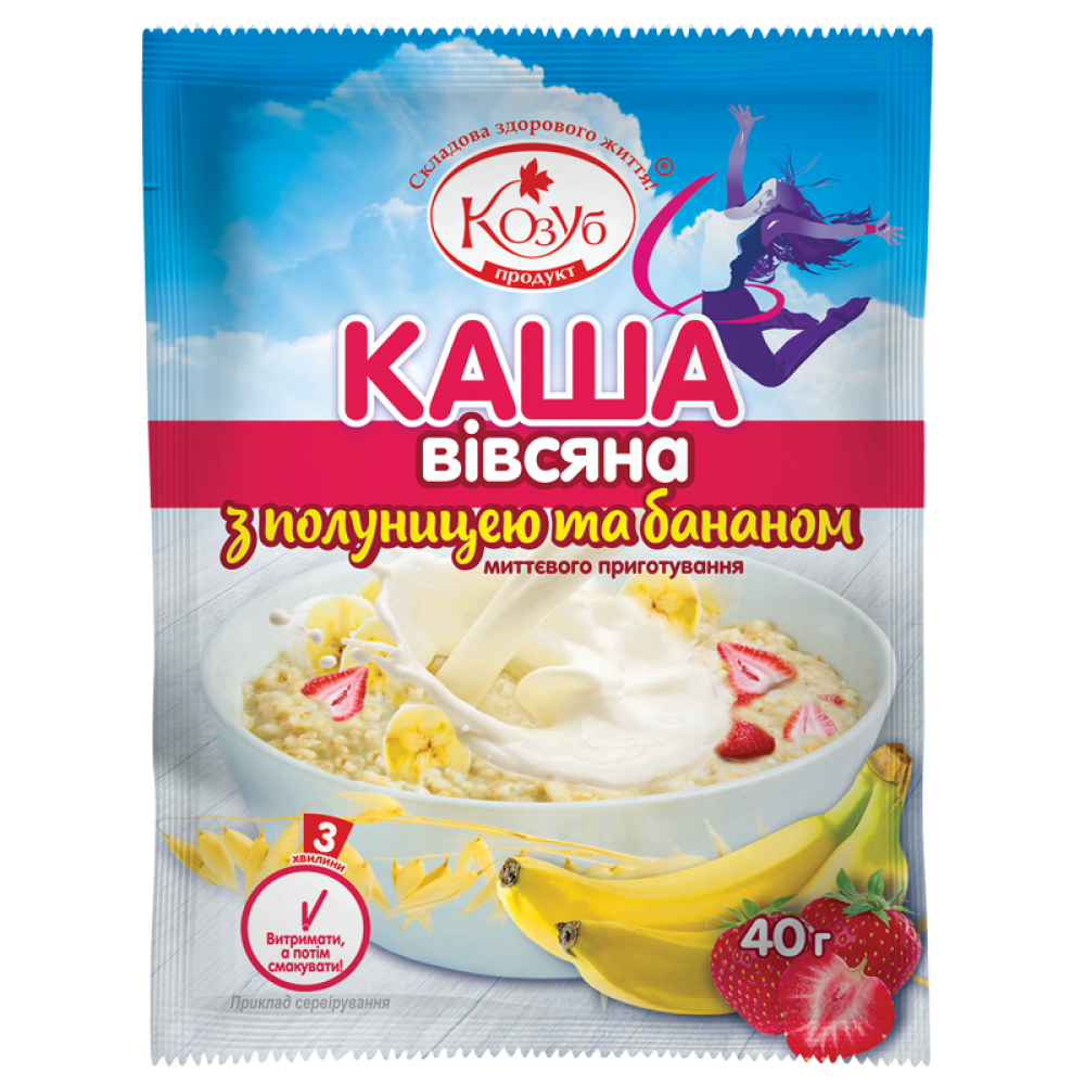 Порційна каша складається з вівсяних пластівців з полуницею та бананом. Для приготування досить залити окропом. Вироблено на основі «Найніжніших*» вівсяних пластівців ТМ Козуб продукт. * У порівнянні з іншими пластівцями ТОВ «Фірма ДІАМАНТ ЛТД». Пластівці не потребують варіння.
