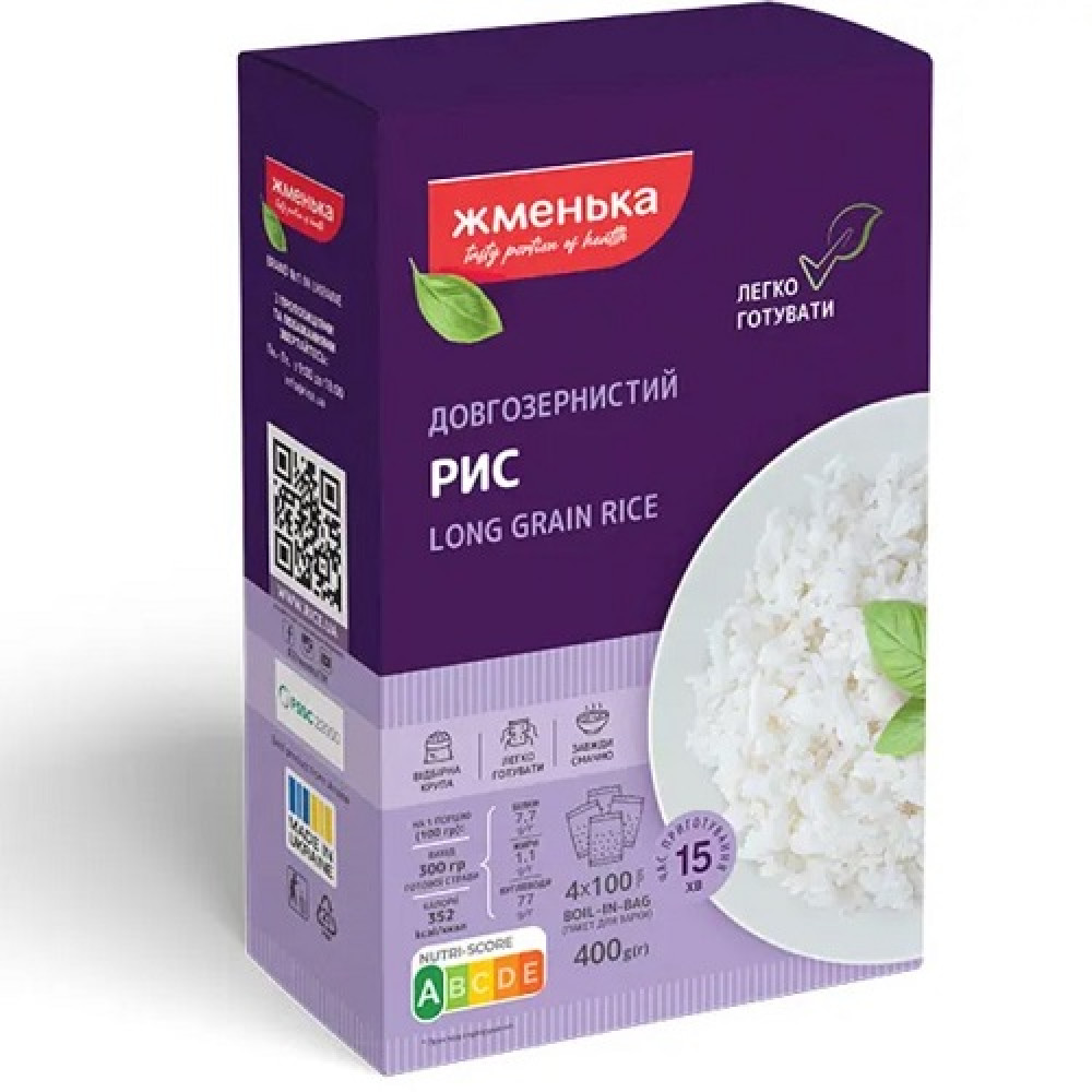 Рис довгозернистий в пакетиках для варіння ТМ «Жменька» – це відбірний шліфований рис, який пройшов додаткову очистку і розфасований у спеціальні термостійкі пакетики для легкого і швидкого приготування.