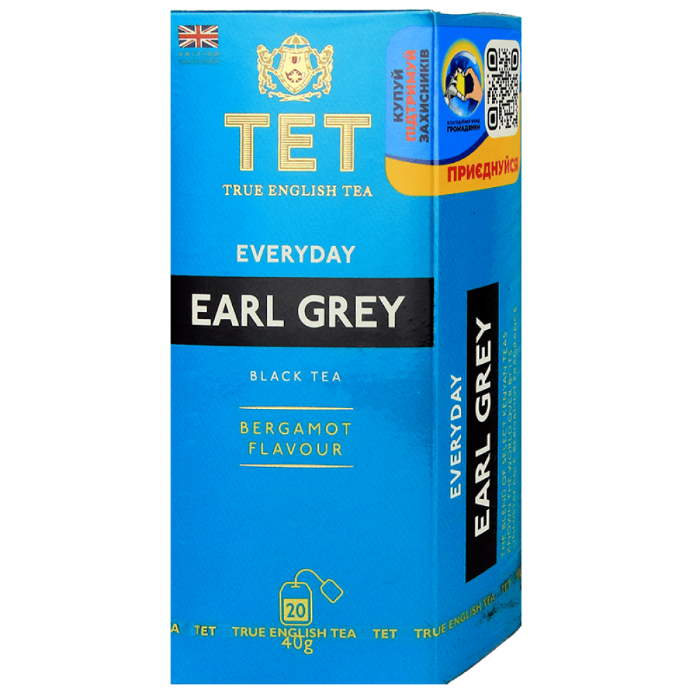 Чорний байховий чай ТЕТ Ерл Грей у пакетиках з ярликом. Містить ароматизатор бергамоту, що надає напою характерний цитрусовий аромат. Призначений для швидкого та зручного приготування.