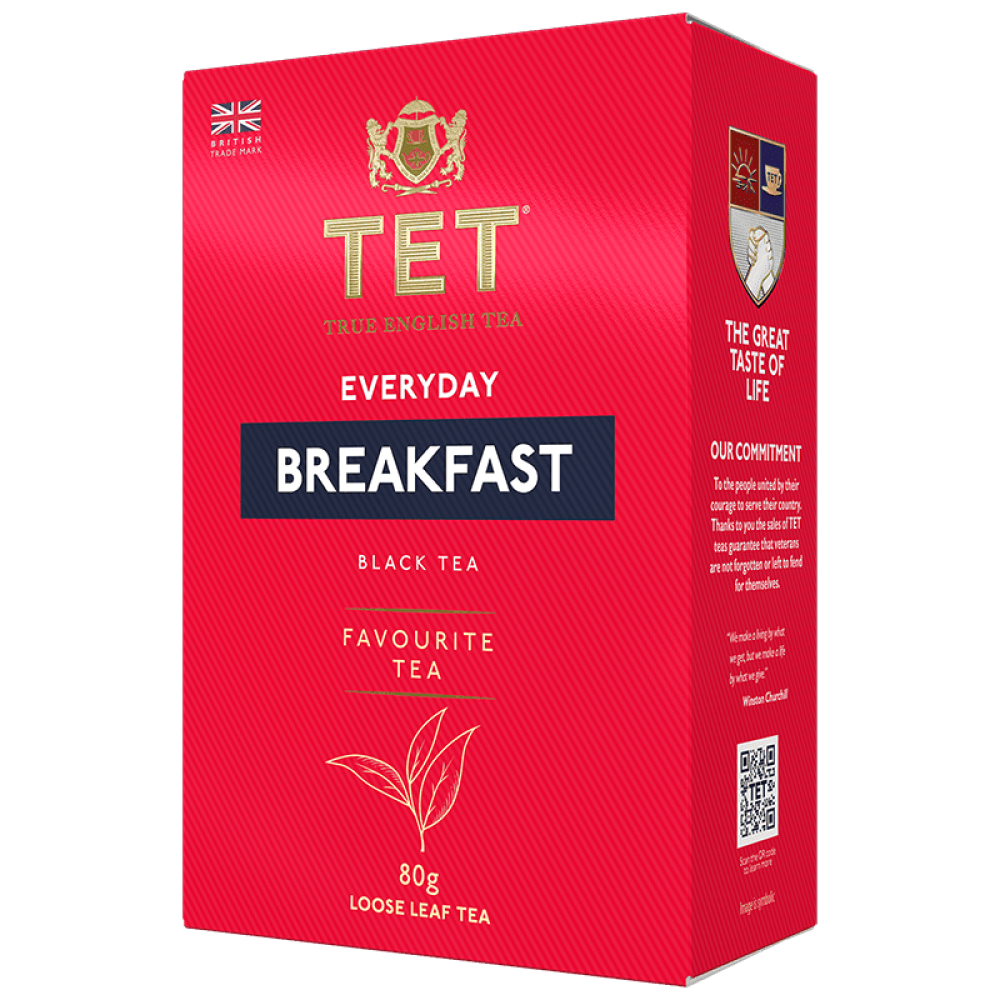 Чорний листовий чай TET "Еврідей Брекфаст" вагою 80 г. Цей чай є класичним вибором для щоденного сніданку, пропонуючи насичений смак та аромат. Виготовлений з добірного чайного листя, він ідеально підходить для початку дня