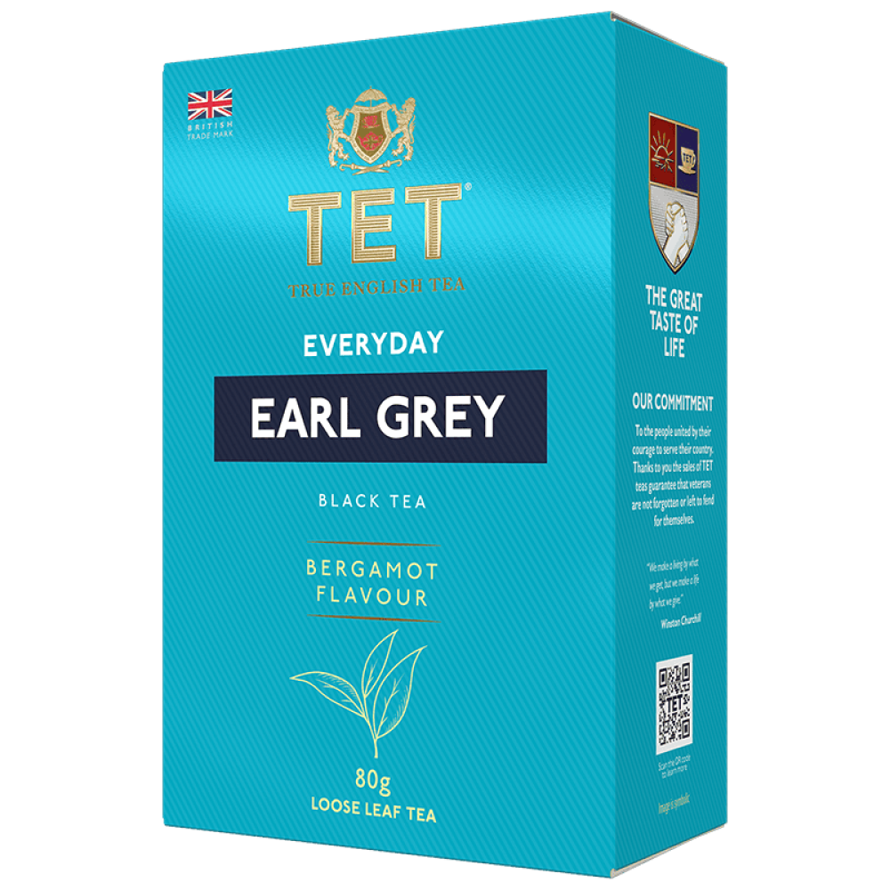 Чорний листовий чай TET Everyday Earl Grey вагою 80 г. Цей чай є класичним поєднанням високоякісного чорного чаю та натурального аромату бергамоту, що надає йому характерний цитрусовий відтінок та вишуканий аромат. Призначений для щоденного вживання, ідеально підходить для поціновувачів традиційного чаю Ерл Грей.