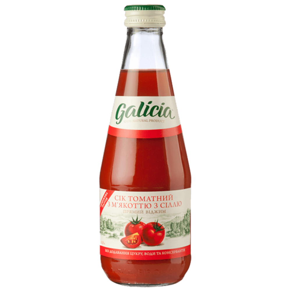 Опис Сік Galicia томатний з м'якоттю з сіллю 0,3л с/б