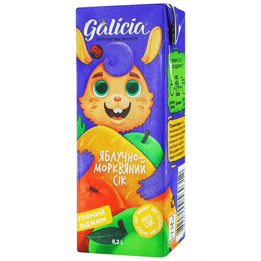 Опис Сік Galicia яблучно-морквяний неосвітлений пастеризований TGA 0,2л