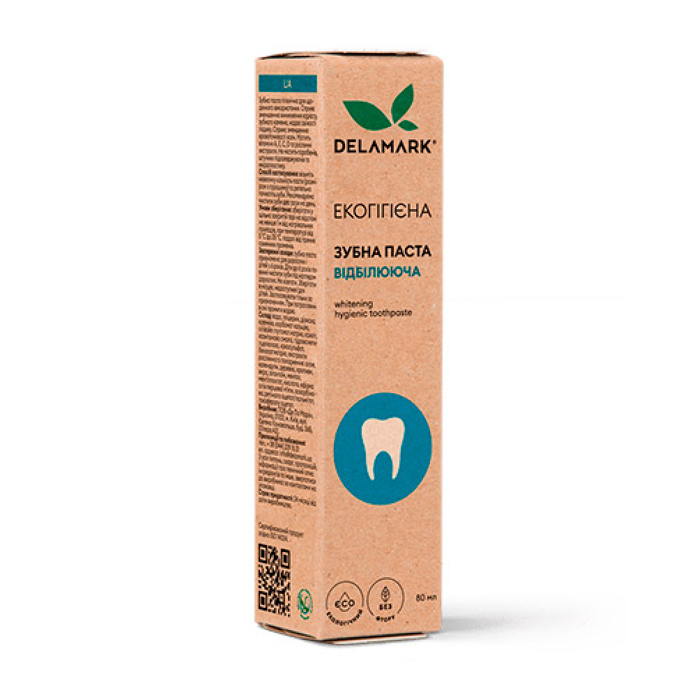 Вибілювальна зубна паста від DeLaMark має екологічне паковання, яке можна переробляти: вона розфасована в алюмінієвий тюбик, поміщений у картонну коробку з вторинної сировини.