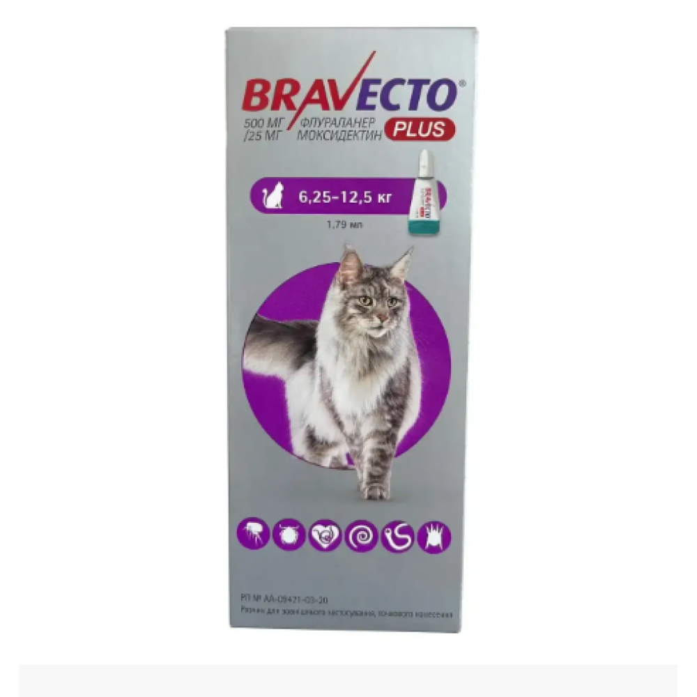 Bravecto Plus Spot-On - інсектоакарицидні краплі Бравекто Плюс Спот-Он для кішок Вага 6,25 - 12,5 кг, 500 мг одна піпетка