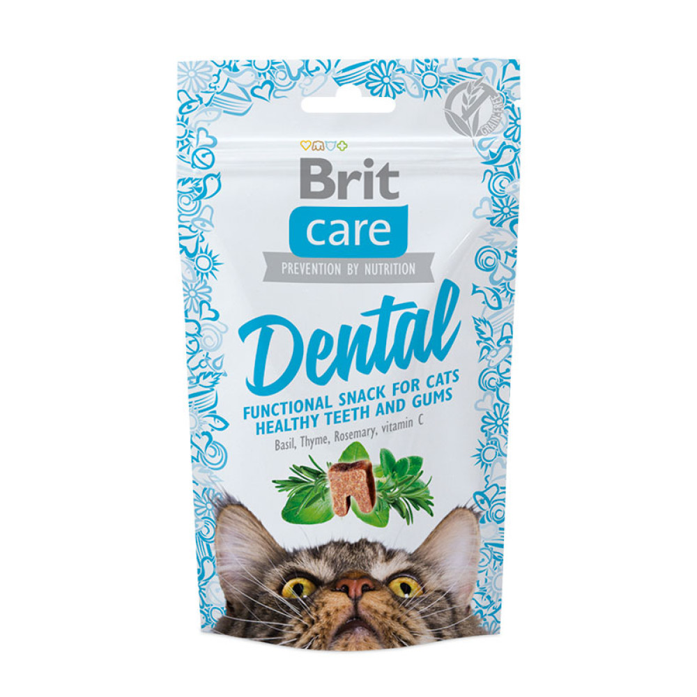 Brit Care Dental з васильком чебрецем, розмарином і вітаміном Зі сприяє очищенню зубів і зміцненню ясен, запобігає утворенню зубного каменю. Також ласощі містить таурін – важлива речовина для здоров'я серцево-судинної системи й гостроти зору. Снеки напівм'якої консистенції, що забезпечує для кішки комфортне споживання ласощі. Brit Care Dental не містить злаків.