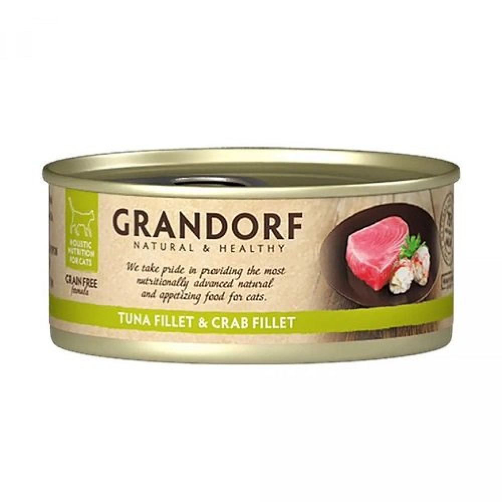 Опис Вологий корм для котів Grandorf Tuna Fillet & Crab Fillet філе тунця з м'ясом краба, 70 г