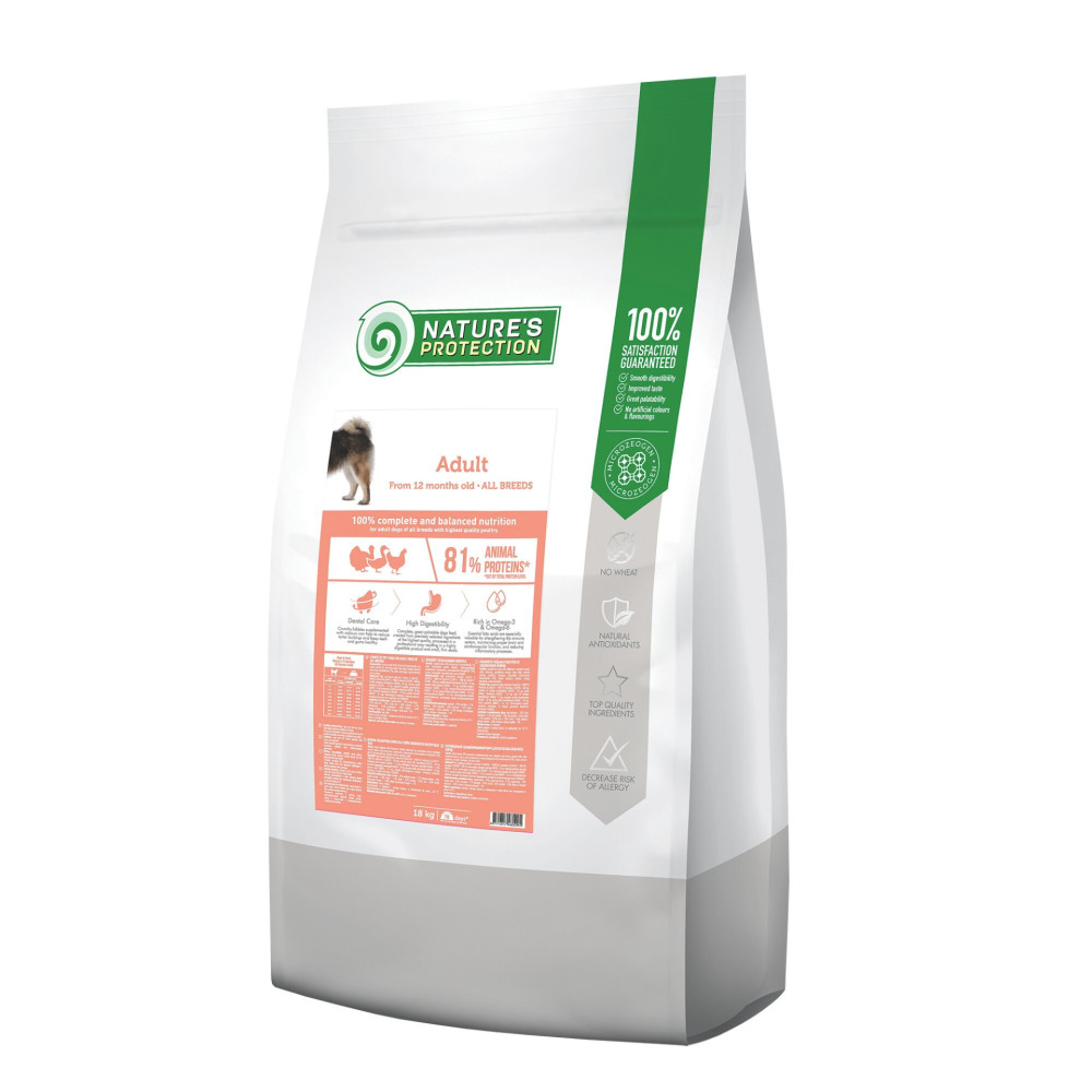 NATURE‘S PROTECTION збалансовані повнораціонні сухі корми Супер-преміум класу, створені для задоволення різноманітних потреб молодих та зрілих собак. Особливо улюблені собаками легкозасвоювані корми не містять генетично модифікованих продуктів і штучних барвників.