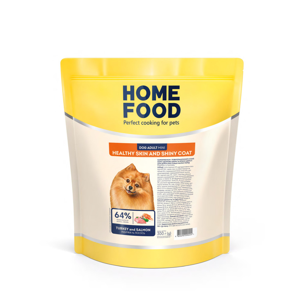 Характеристики Сухий корм HOME FOOD здорова шкіра та блиск шерсті для дорослих собак малих порід Індичка та лосось Healthy skin and shiny coat, 300 г