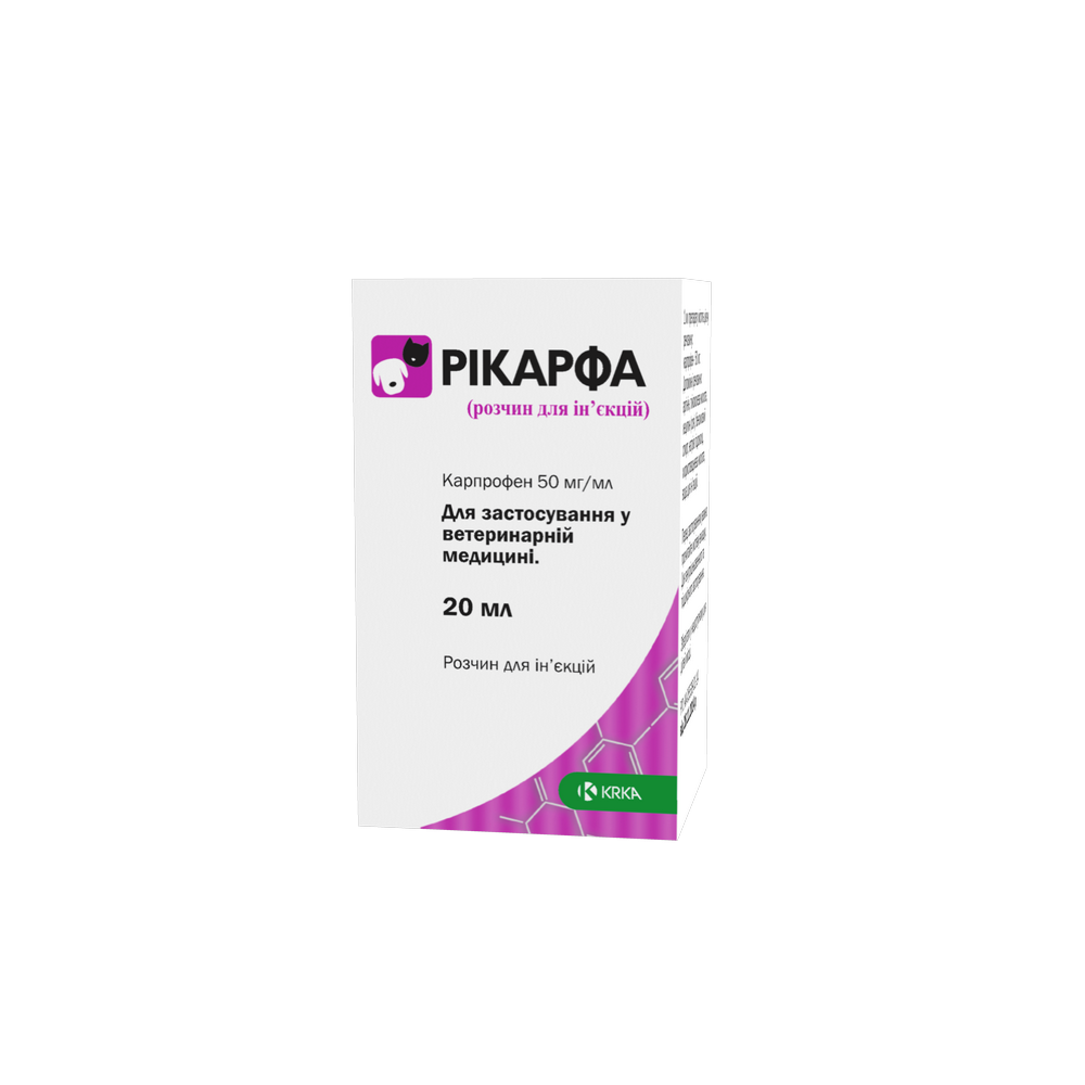 Опис Розчин KRKA Рікарфа для ін'єкцій, протизапальний, для собак та котів, 50 мг/мл, 20 мл
