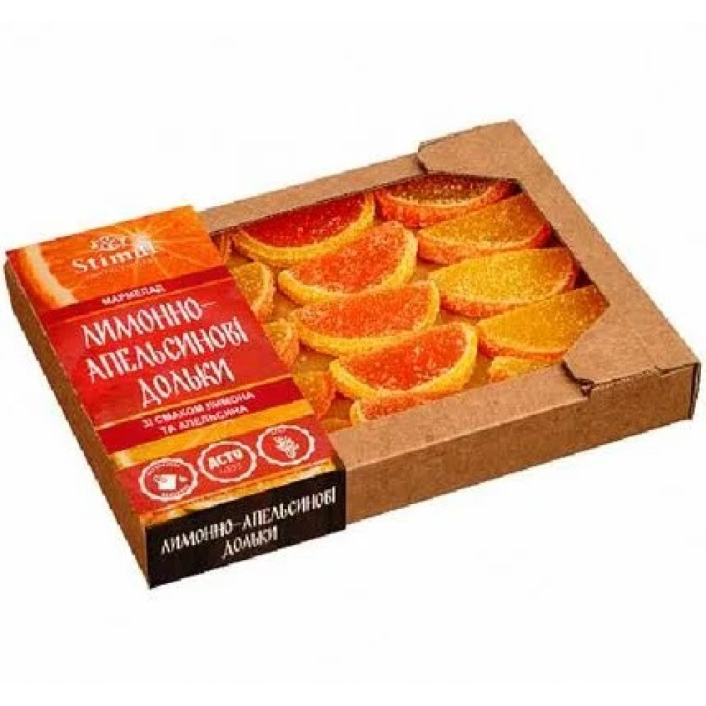 Мармелад у вигляді лимонних і апельсинових часточок із скориночкою, обсипанних цукром, двох кольорів і ароматів (лимон і апельсин). Желіруюча речовина – агар.