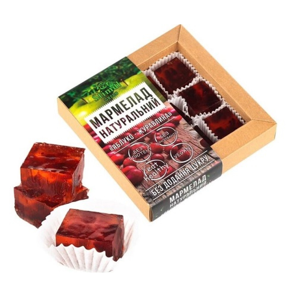 Натуральний мармелад "Яблуко-журавлина" без цукру – це соковитий і ароматний десерт, виготовлений на основі яблучного пюре зі смаком журавлини. Без додавання цукру і глютену, є джерелом вітамінів і клітковини. Ідеально підходить для здорового перекусу.