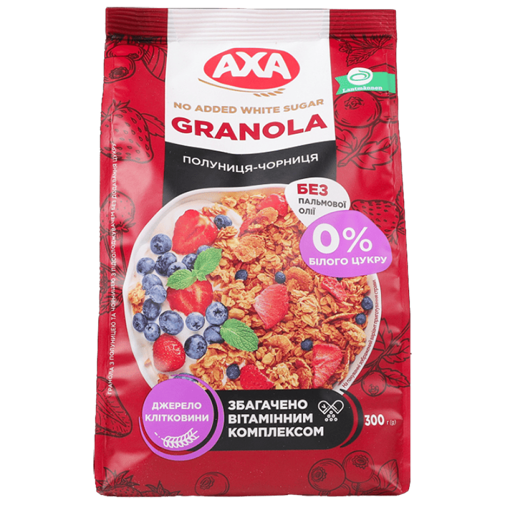 Характеристики Гранола АХА з полуницею та чорницею з підсолоджувачем без додавання цукру 300 г