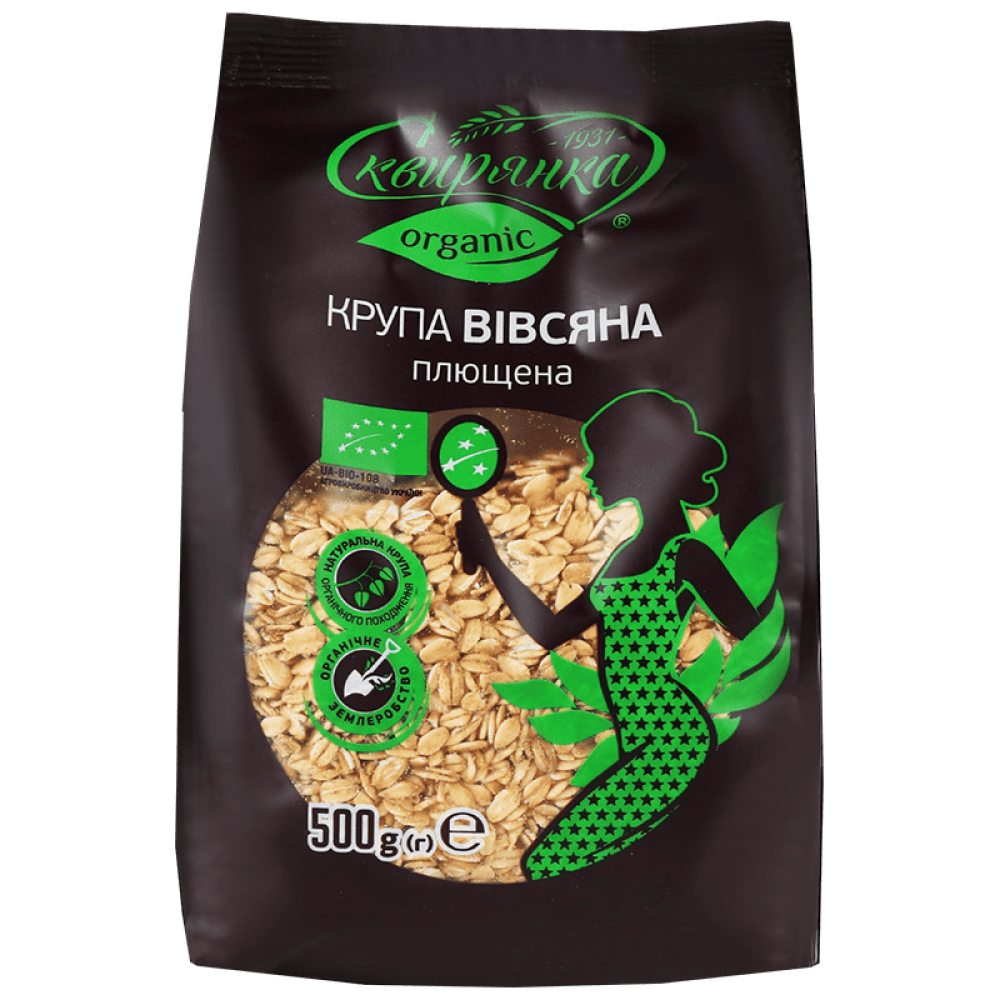 Крупа органічна вівсяна плющена Сквирянка — отримують її в результаті плющення вівсяної неподрібненої крупи, вирощеної без застосування агрохімії.