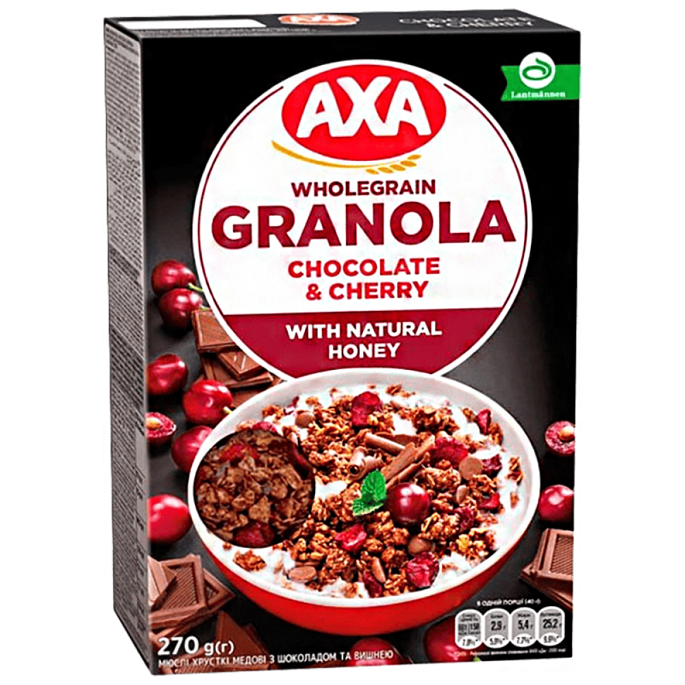 Мюслі медові AXA Гранола з вишнею та шоколадом - смачний, здоровий та корисний сніданок для всієї родини з додаванням натурального меду. Це повністю готова суміш із корисних злаків, ягід, шоколаду та інших солодощів. Мюслі є багатим джерелом клітковини та повільних вуглеводів. Продукт забезпечує організм всілякими вітамінами, білками та мінеральними речовинами та зарядом енергії протягом усього дня. При виробництві не використовуються консерванти та штучні харчові добавки. Можна використовувати як перекушування протягом дня.