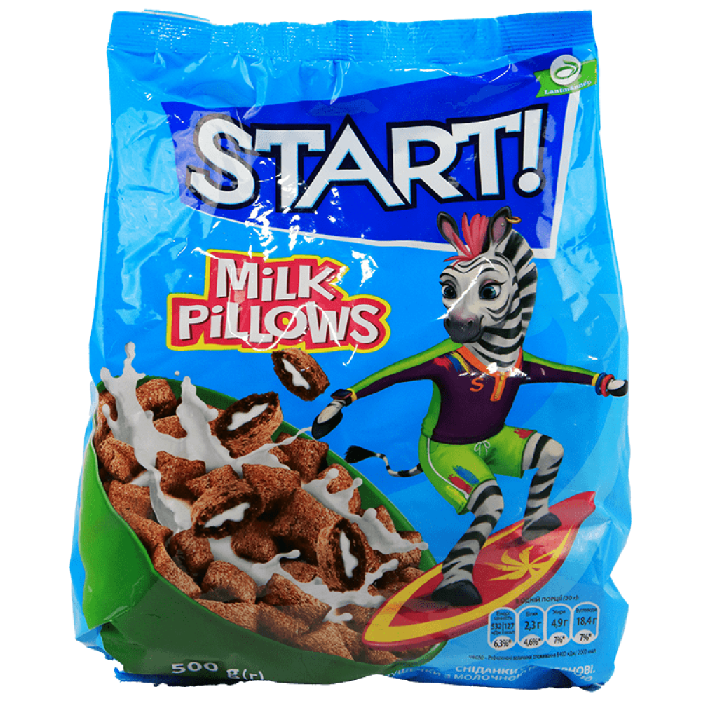 Хрусткі зернові подушечки START! з ніжною молочною начинкою. Цей продукт є ідеальним вибором для швидкого та поживного сніданку або легкого перекусу. Подушечки є джерелом енергії та чудово смакують з молоком, йогуртом або кефіром.