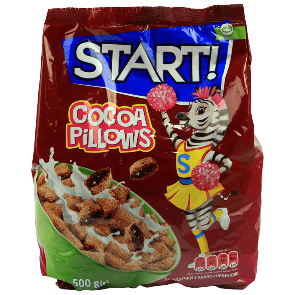 Хрусткі подушечки START! з ніжною какао-начинкою. Ідеально підходять для швидкого та поживного сніданку, добре поєднуються з молоком, йогуртом або кефіром. Виготовлені на основі пшеничного та кукурудзяного борошна.