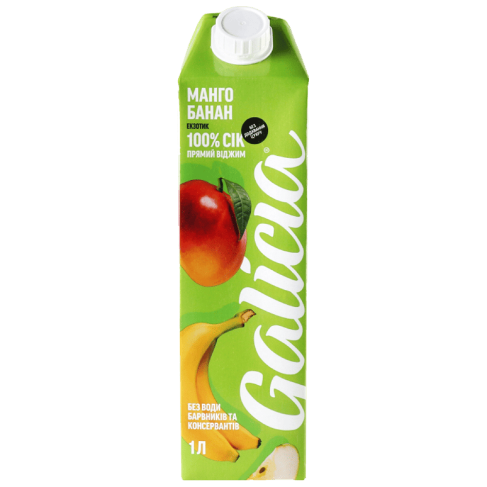 Сік Galicia Манго банан - повністю натуральний сік із суміші яблук, манго та банана. Багатий на вміст вітамінів і мінералів з приємним смаком.