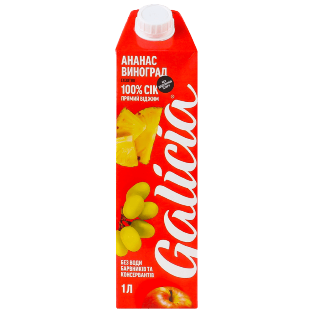 Сік Galicia яблучно-виноградно-ананасовий — це натуральний неосвітлений пастеризований напій прямого віджиму, представлений у форматі 1 л. 100% сік прямого віджиму без додавання цукру, води, барвників та консервантів.