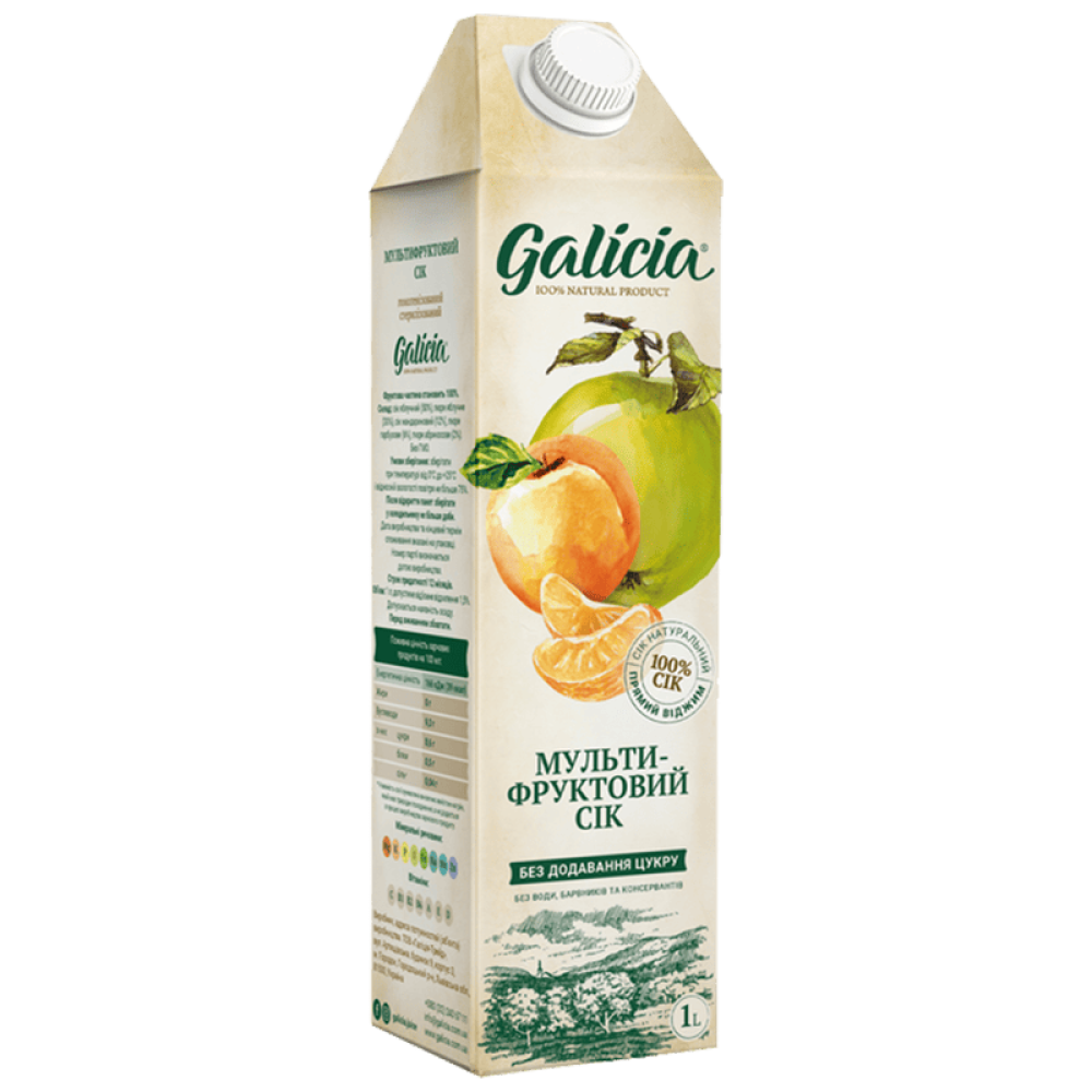 Мультифруктовий сік із м'якотою Galicia. Такий популярний і освіжний напій покращує травлення, сприяє опірності організму захворюванням і додає життєвої енергії.