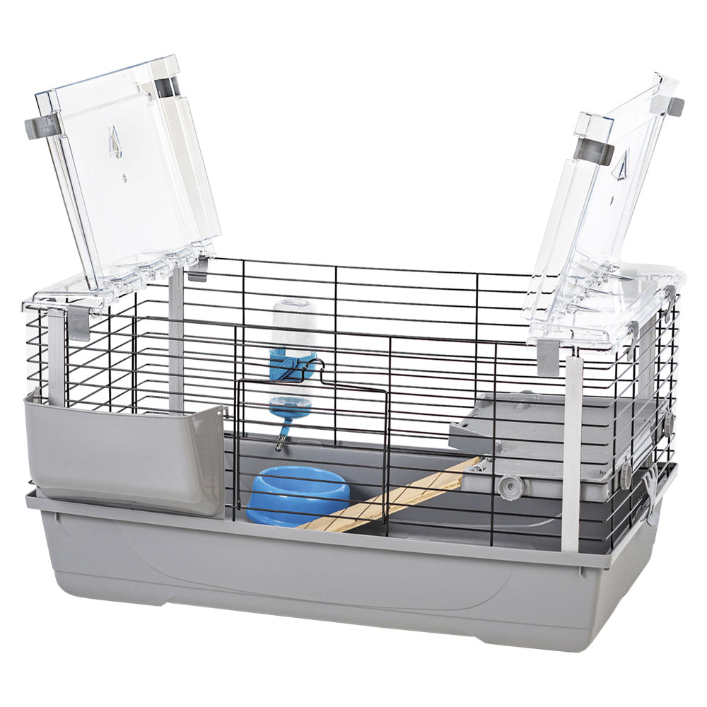 Легко устанавливается и чистится. Оборудована прочной, неострой сеткой и двойным предохранительным замком с обеих сторон. Клетка изготовлена из высококачественных материалов и идеально подходит для ежедневного использования. Оборудована пластиковой полкой и лестницей. Пластиковая крыша с возможностью открывания сверху.