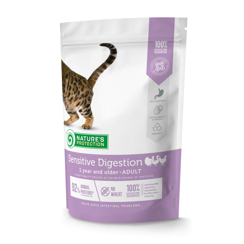 Nature's Protection Sensitive Digestion Adult – полнорационный, сбалансированный сухой корм для взрослых кошек (от 1 года и старше), улучшающий работу желудочного-кишечного тракта. Легкоусвояемый корм имеет приятный для животных вкус.