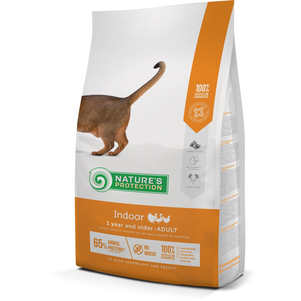 „Nature's Protection Indoor Adult“ – полнорационный сухой корм для взрослых домашних кошек. Поддерживает жизненную энергию, способствует здоровой и продолжительной жизни питомца. Сниженное количество жиров и L-карнитин помогают урегулировать и поддержать оптимальный вес тела кошки.