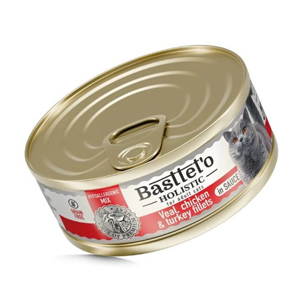 Характеристики Влажный корм Basttet`O Holistic Кусочки филе телятины, курицы и индейки в соусе для кошек 85г