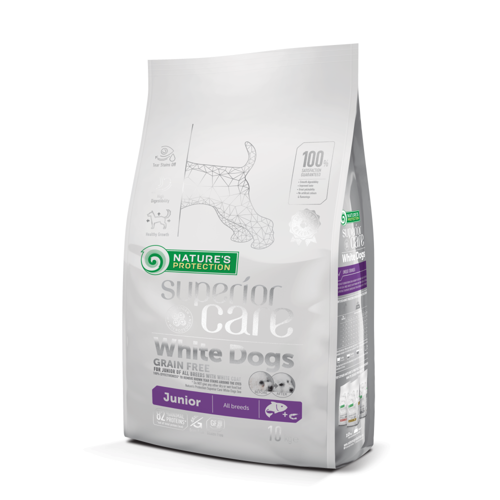 Nature's Protection Superior Care White Dog - беззерновой сухой корм супер- премиум класса для собак младшего возраста (2-12 месяцев), всех пород, белых и светлошерстных собак. Этот корм предназначен для здорового роста щенка(размер гранул 6-8мм).