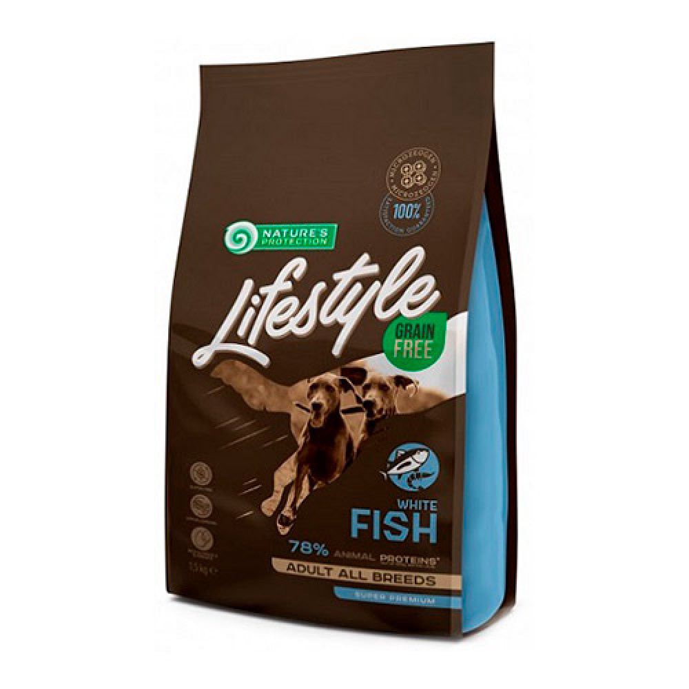 Характеристики Сухой беззерновой корм с белой рыбой для взрослых собак всех пород Lifestyle Grain Free White Fish Adult All Breeds 1.5кг