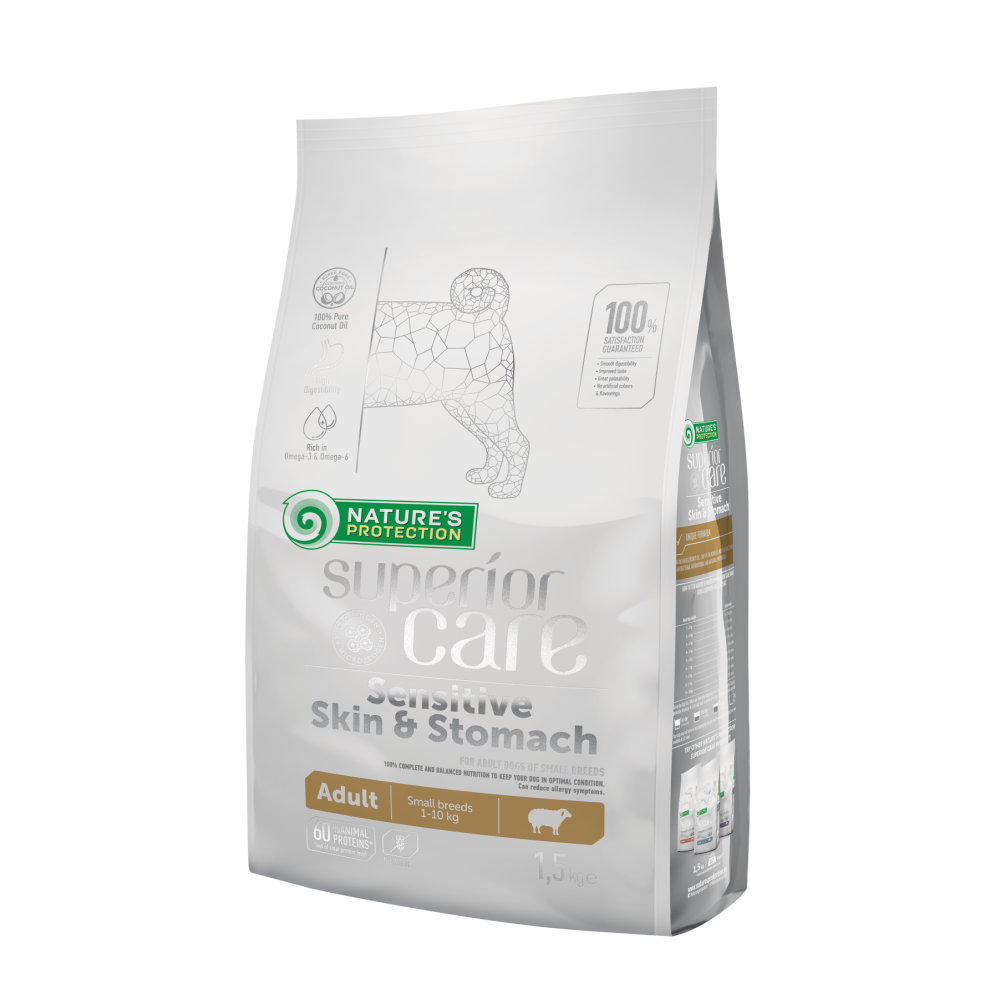 Характеристики Сухой корм для взрослых собак с чувствительным пищеварением и проблемной кожей, для малых пород Superior Care Sensitive Skin&Stomach Adult Small Breeds 1.5кг