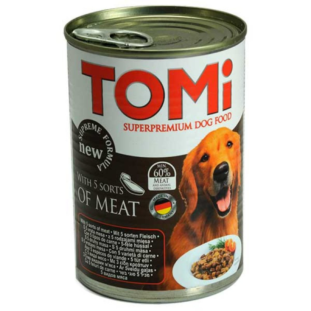 Описание TOMi - консервы TOMi 5 видов мяса в соусе для собак 400 г