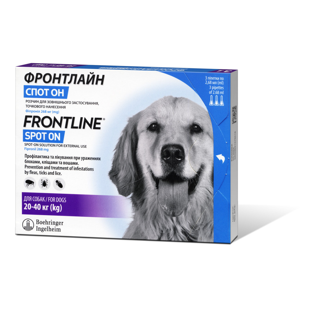 Капли Берингер Ингельхайм Фронтлайн Спот Он от блох и клещей для собак, L (20-40 кг)Boehringer Ingelheim (Берингер Ингельхайм) Фронтлайн Спот Он для собакФронтлайн Спот он инсектоакарицидный препарат, содержащий в качестве девствующего вещества фипронил, а также вспомогательные вещества и растворители.Фронтлайн Спот он представляет собой бесцветную прозрачную жидкость со слабым специфическим запахом.Фармакологические свойстваФипронил, входящий в состав препарата блокирует рецепторы ГАМК паразита и обладает выраженным инсектицидным и акарицидным действием в отношении вшей, блох, власоедов и клещей (иксодовые, хейлителлы, отодектозы) паразитирующих на собаках и кошках. Препарат эффективен на всех стадиях развития паразитов.Фронтлайн Спот он не является препаратом системного действия, он накапливается в эпидермисе и сальных железах животного и оказывает контактное инсектоакарицидное действие на эктопаразитов.Фронтлайн Спот он в течении 24 часов постепенно распределяется по всей поверхности тела и обеспечивает защиту животных от эктопаразитов, продолжительность защиты животных от клещей у кошек 15-21 день, у собак 2-2,5 мес.Повторные обработки животных проводят по истечению указанных сроков.Фронтлайн Спот он по степени воздействия на организм относится к группе малотоксичных веществ согласно ГОСТ 12.1.007.76, не оказывает кожно-резорбтивного, сенсибилизирующего, эмбриотоксического, тератогенного и мутагенного действия. При попадании в глаза вызывает слабое раздражение.Порядок применения.Препарат Фронтлайн Спот он применяют для борьбы с блохами, вшами, власоедами и клещами (иксодовые, хейлителлы, отодектозы) собак, путем топикального (точечного) нанесения препарата на кожу. Перед обработкой у пипетки отламывают кончик, раздвигают у животного шерсть в области спины (между лопатками) и нажимая на пипетку наносят препарат в одну или несколько точек. В зависимости от вида и массы животных используют пипетки Фронтлайн Спот он различного объема:Препарат Фронтлайн Спот он применяют для лечения отодектоза (ушной чесотки). С этой целью закапывают в каждое ухо по 4-6 капель (капли обязательно вводят в оба уха). Для равномерного распределения препарата ушную раковину складывают пополам и слегка массируют ее основание, остаток нанесите на кожу между лопаток (однократная обработка).Препарат Фронтлайн Спот он не разрешается применять щенкам моложе 8-недельного возраста.Не рекомендуется мыть животных в течении 48 часов после обработки препаратом.Побочных явлений и осложнений у животных при применении препарата Фронтлайн Спот он нет.Меры предосторожностиПри работе с препаратом следует соблюдать правила гигиены и личной безопасности, предусмотренные для работы с ветеринарными лекарственными средствами. Не следует гладить животное в течении 24 ч после обработки.Формы выпуска и условия храненияВыпускают Фронтлайн Спот он в форме 10 % раствора для топикального (точечного) нанесения, расфасованным по 0,5; 0,67; 1,34; 2,68 и 4,02 мл в полиэтиленовые пипетки с отламывающимся кончиком, помещенные по 1 штуке в блистер, на котором указаны названия фирмы-изготовителя и ее товарный знак, объем, назначение и состав препарата, номер серии, дата изготовления. Каждый блистер упакован в картонную коробку. Каждую коробку маркируют с указанием названия фирмы-изготови
