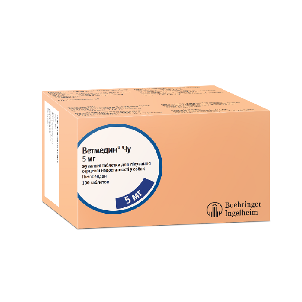 Описание Таблетки жевательные Boehringer Ingelheim Ветмедин Чу для собак с сердечной недостаточностью, 5 мг, 100 табл